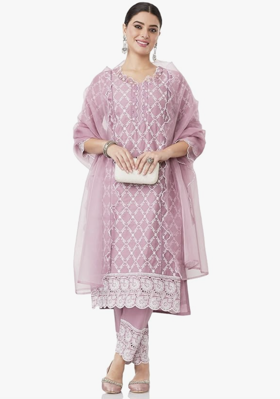 - This elegant 3-piece salwar suit set features a regular-fit kurta with all-over schiffli embroidery & lace detailing, straight-fit pyjamas with hem embroidery, and solid organza dupatta with scallop edge on borders.
